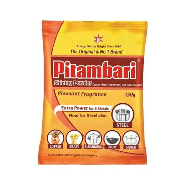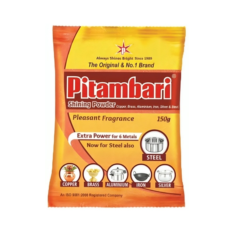 • Pitambari Shining Powder is carefully made to quickly remove tough stains, grime, and grease from iron, copper, brass, bronze, stainless steel, and aluminium surfaces, leaving them clean, shiny, and like new.